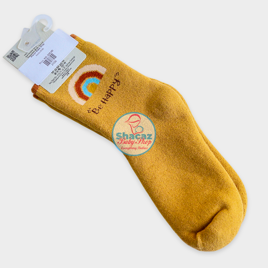 A delightful of soft, comfortable baby socks from Shacaz Baby Shop, designed to keep little feet cozy and stylish. This set includes three unique pairs: one cheerful yellow pair featuring an embroidered rainbow and the phrase “Be Happy”, one solid muted purple pair, and one solid mustard orange pair.