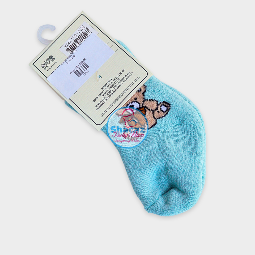 - Design: These are ankle-length children’s socks featuring a large embroidered teddy bear motif.