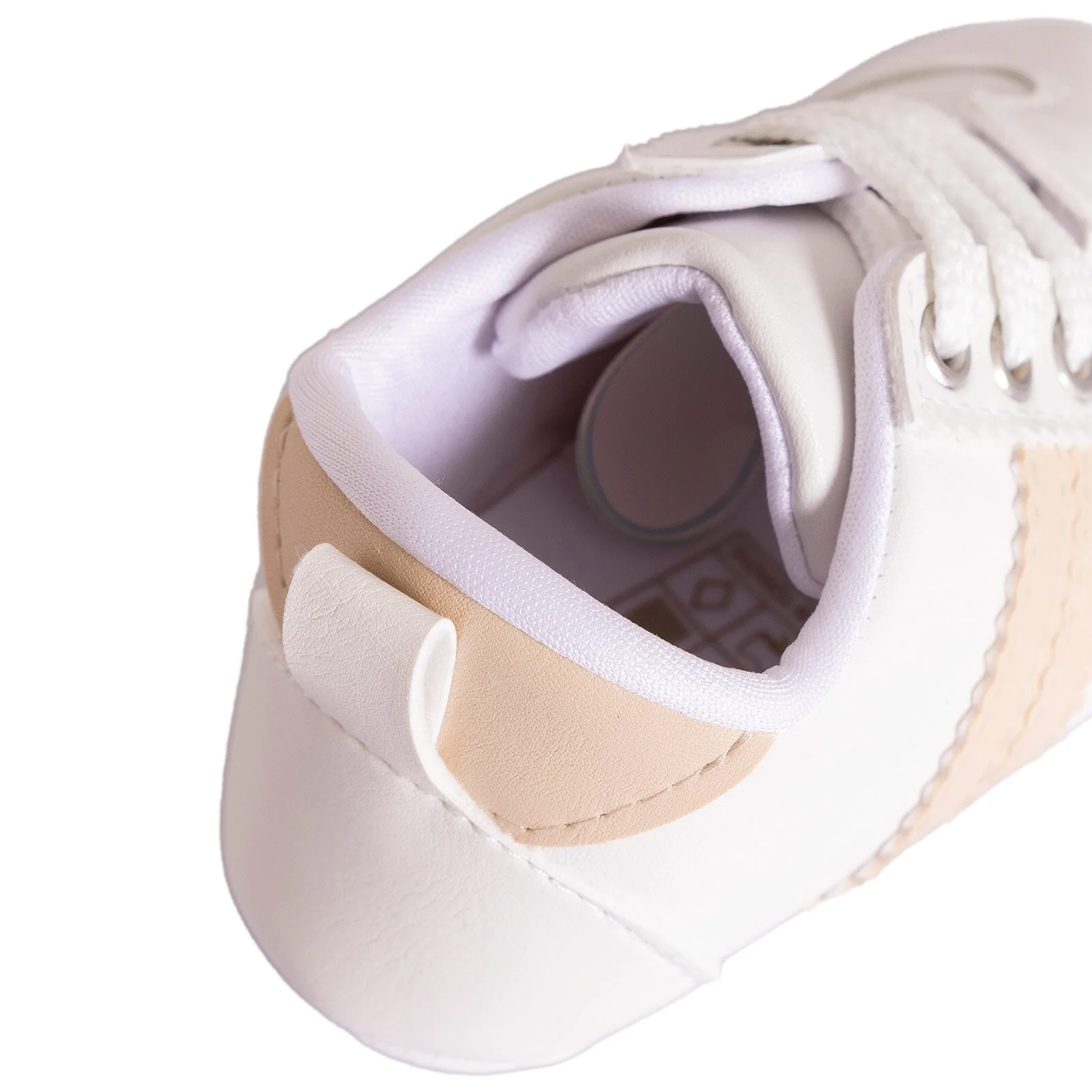 - Color/Style: White with a brown side stripe and white laces.